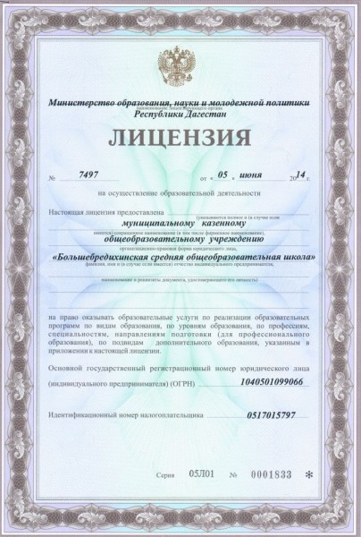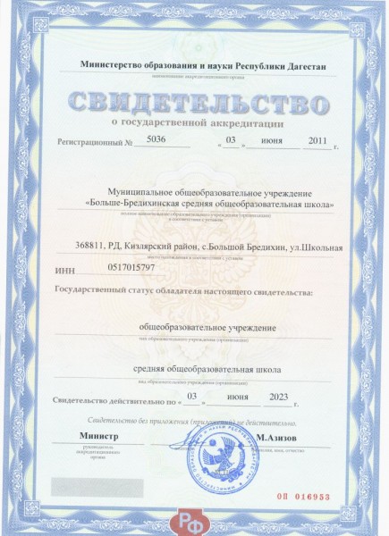 Полное наименование образовательной организации* Муниципальное казенное образовательное учреждение "Большебредихинская средняя общеобразовательная школа" Кизлярского района Республики Дагестан"